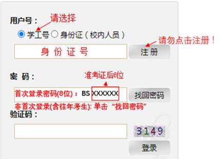 财务处”,在“业务办理”中选“学生缴费”。考生账号已开通,切勿自行注册。复试收费标准:80元/生(仅申请考核考生,硕博连读考生无须缴费)。用户号选择“学工号”,输入正确的身份证号。缴费系统初始密码(8位)为大写字母“BS”加准考证编号后6位(准考证查看网址://yzgmis.tuoku-8.com/zsgl/bswb/login.aspx),如“BS123456”。非首次登录缴费系统的考生(含往年报考考生及误注册考生)使用“找回密码”,登录并缴费。