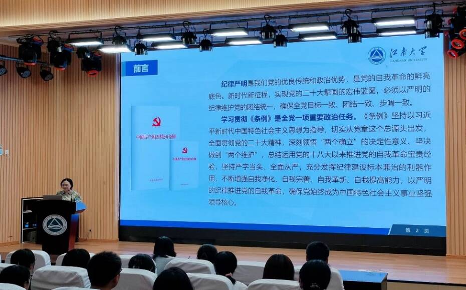 党委书记向琪为护理系党支部、基础医学系党支部、护理硕士生第一党支部、护理硕士生第二党支部和博士生党支部全体党员讲授专题党课。本次党课旨在推动党纪学习教育走深走实,进一步强化党员的纪律意识,提高党员的政治站位,加强党支部的纪律建设。
