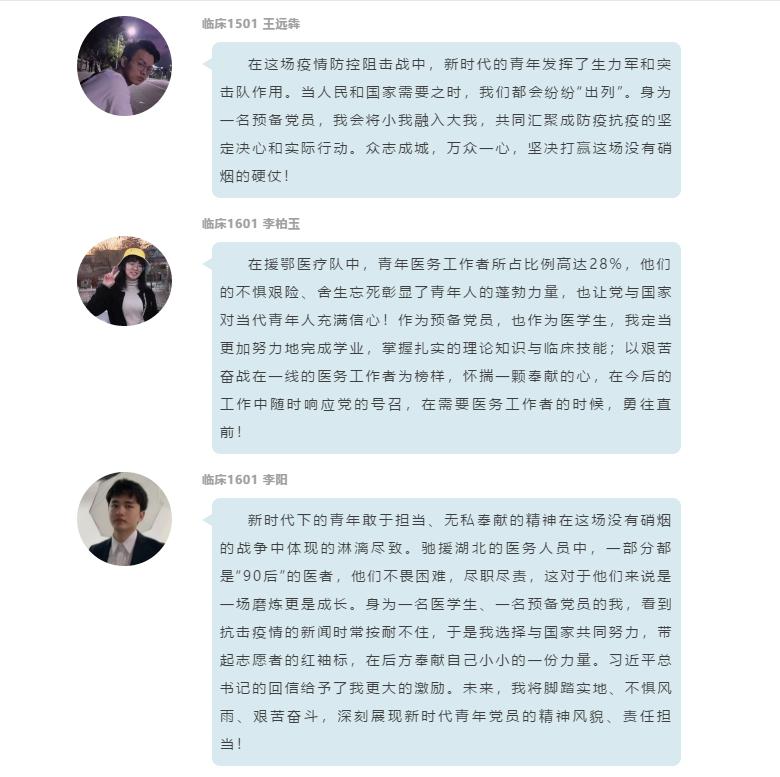 还有20多名学生党员提笔抒发自己心中的感慨。他们认为,身为“90后”的医学生党员,习近平总书记的回信给予了大家很大的鼓励,将激励大家继续坚守入党时的初衷和誓言,践行“健康所系,性命相托”的医学生誓言。未来,大家会努力提高专业水平,精进操作能力,将自己的所学用在人民需要的地方,用在国家需要的地方。作为“90后”的一代,会用实际行动来证明新时代青年人的家国情怀与责任担当。