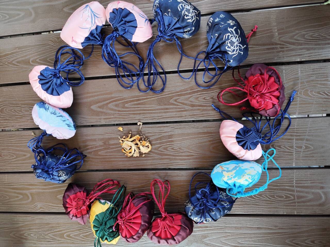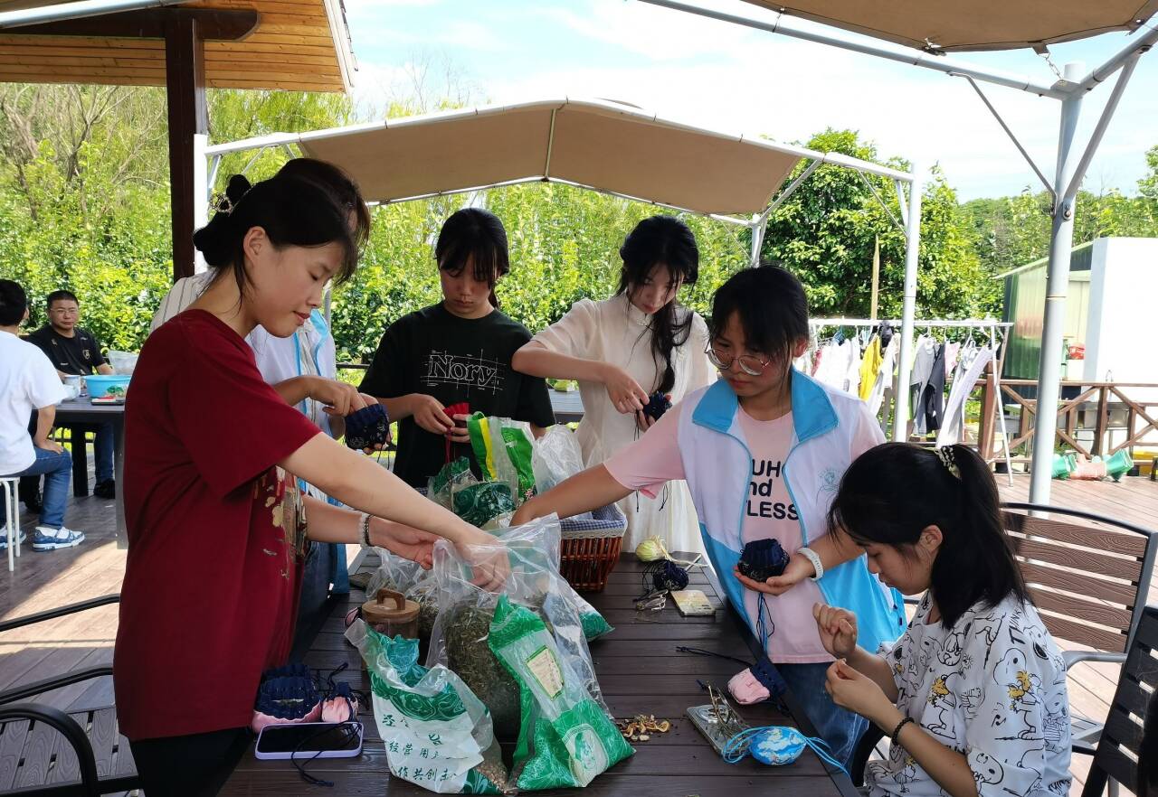 之后,就到了制作香囊的环节。实践团成员们根据自身所需,亲手挑选香囊及薄荷、艾草、肉桂等药草,学习“君臣佐使”的中药配伍关系,按照老师的指导进行配比与缝制。不一会儿,一个个精致小巧、香气扑鼻的香囊便呈现在眼前。这些香囊不仅美观实用,更蕴含着实践团成员们对中医药文化的热爱与传承之心。
