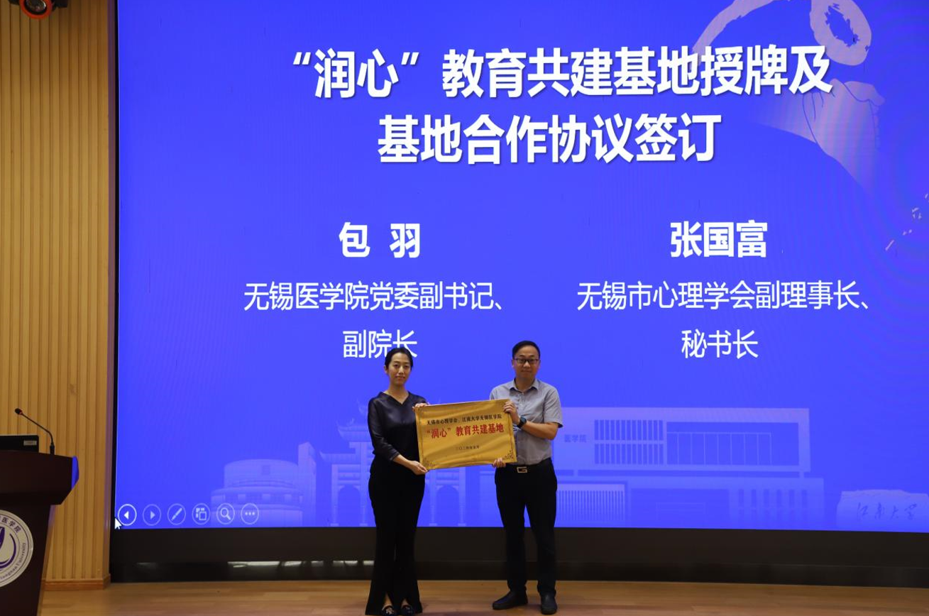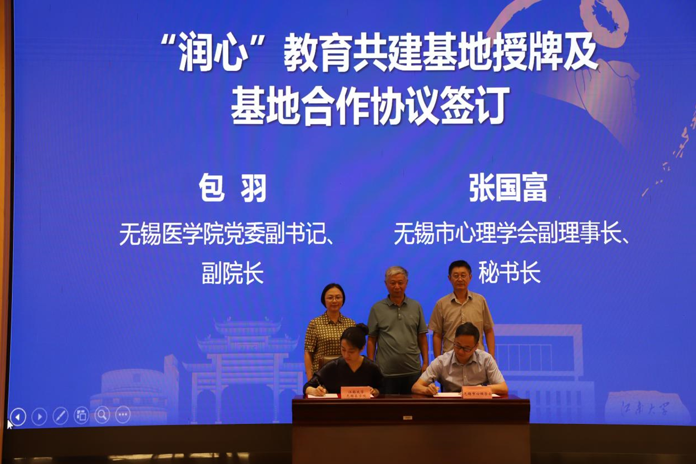 党委副书记、副院长包羽为“润心”教育共建基地活动揭牌并签订基地合作协议,无锡市心理学会王国强理事长,校关工委常务副主任娄国栋,脱裤吧