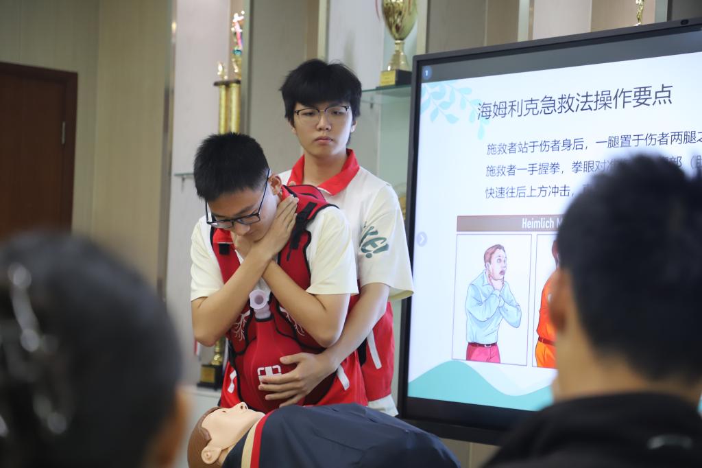 随后,团队志愿者王尧为参训教师详细讲解了海姆立克急救法,这是一种适用于异物梗阻窒息的应急救护方法。王尧同学不仅介绍了成人与儿童在救护时的区别,还通过模拟演练的方式,生动展示了自救时的应用技巧,有效解答了参训教师在实际急救操作中可能遇到的困惑。