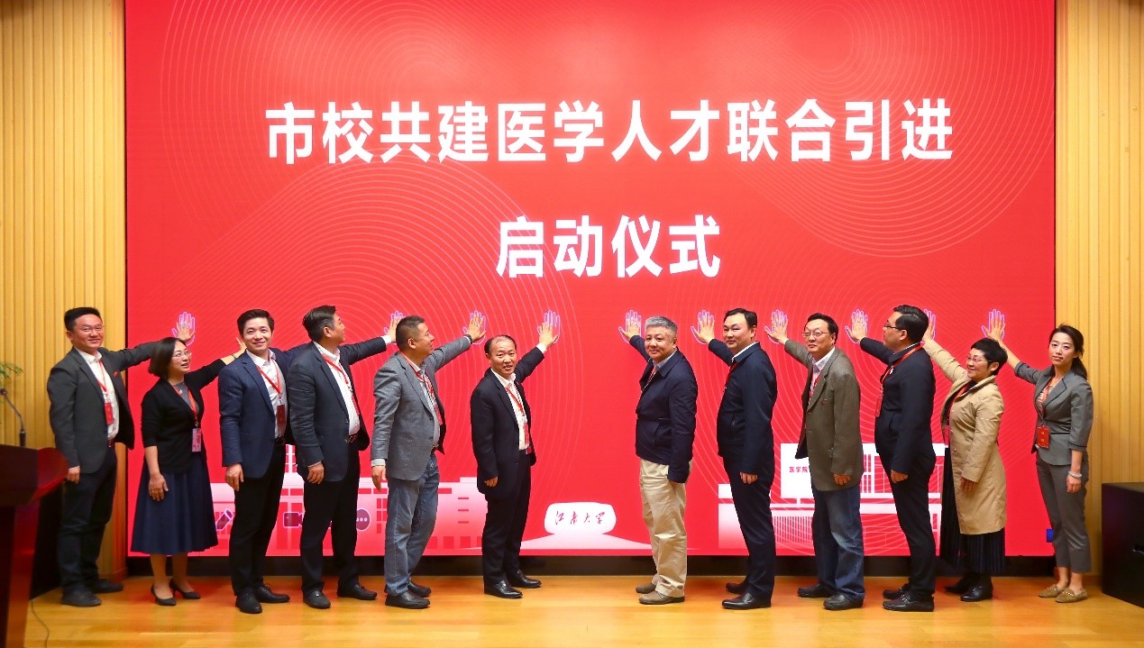 和附属医院的角度出发,介绍了两院发展历程、学科特色以及引人政策。随后举行了市校共建医学人才联合引进启动仪式,参会领导一起按下了启动手印,见证了这一激动人心的时刻。