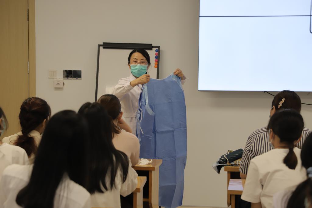 附属医院主任护师、感染管理处处长华皎演示隔离衣等用品的穿脱操作