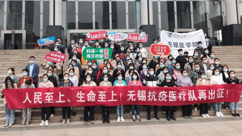 教师志愿服务队和无锡其它抗疫医疗队在无锡市人民大会堂集体出征,市卫健委党委副书记王新华等领导为所有队员送行,叮嘱队员们发扬伟大抗疫精神,充分借鉴以往援助救治经验,圆满完成任务,同时加强安全防护,平安归来。