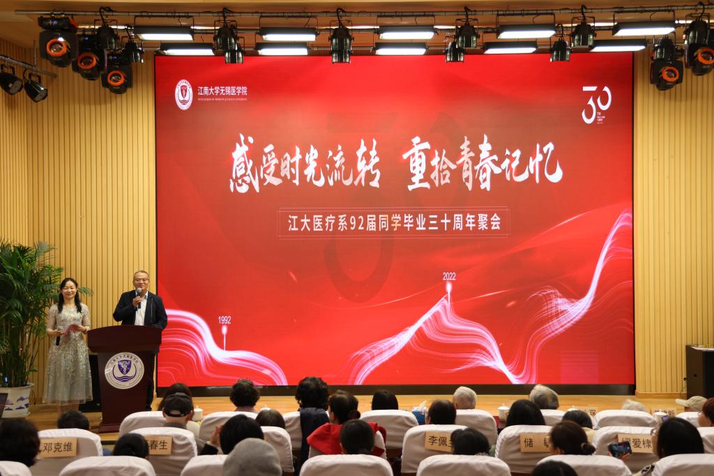 三位92届学生代表发言。江阴同学代表朱敏发言,他用“感恩”和“祝愿”表达三十年来的感悟。他感恩医疗系老师对大家的培养,回忆了三十年前求学的种种趣事,并祝愿脱裤吧