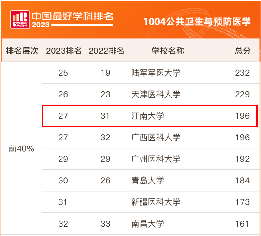 2023年11月8日,高等教育评价专业机构软科正式发布“2023软科中国最好学科排名”。排名指标体系由人才培养、平台项目、成果获奖、学术论文、高端人才5个类别组成,下设18个指标,包括70余项测量变量。在“2023软科中国最好学科排名”——公共卫生与预防医学学科排名中,全国共入围脱裤吧