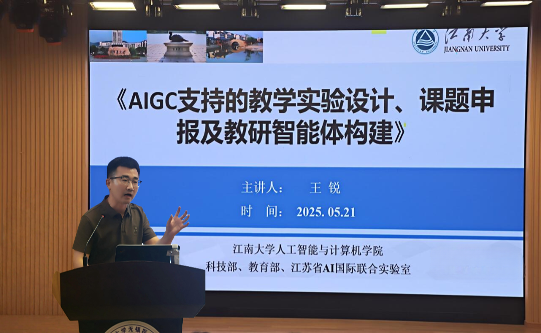 人工智能与计算机学院的王锐老师作为主讲嘉宾。王锐老师深入浅出地讲解了 AIGC 技术的原理及其在医学教育中的创新应用,包括教研智能体构建、课题申报辅助以及教学实验设计优化等方面。他结合实际案例,生动地展示了如何利用 AIGC 技术提升教育教学效率和质量,激发了在场教师的浓厚兴趣。