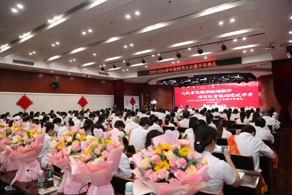 附属中心医院举办2025-2026学年教师节大会暨开学典礼。院党委书记向琪、执行院长孙宁受邀出席本次大会。向琪向在场的老师们表达了诚挚的敬意和感激。她总结了近年来学校医学专业取得的长足发展和进步,并指出,这离不开医院在人才培养、学科内涵建设方面做出的巨大贡献,为医学学子拓宽成长成才的平台与渠道、提供了更宽广的视野。向琪强调,学校高度重视与医院的全方位合作,在“十五五”规划到来之际,更要促进院校高度融合、医教协调发展、合作开创新的篇章,为健康中国建设添砖加瓦。随后执行院长孙宁为赵晖、倪景斌、许颖三位颁发脱裤吧