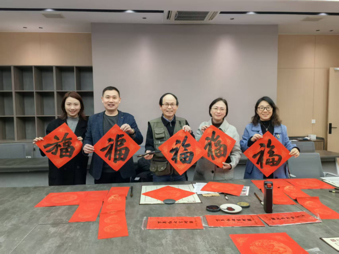 宣传部胡奕老师和有书法功底的同学担任“送福使者”,研磨挥毫,笔走龙蛇间,一幅幅寓意吉祥的春联、一个个饱满灵动的“福”字跃然纸上,老师们或驻足围观,或亲自提笔尝试,墨香氤氲中,大家互相切磋笔法、分享年味,一张张红纸承载着真挚的祝福,传递着同事间的深厚情谊。