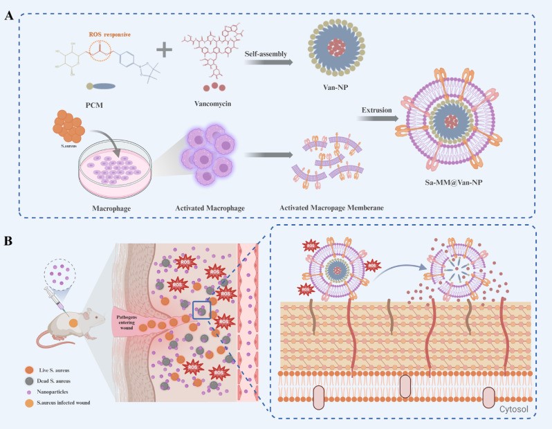 吕国忠教授团队在《Journal of Nanobiotechnology》期刊,发表了题为“Bacteria-activated macrophage membrane coated ROS-responsive nanoparticle for targeted delivery of antibiotics to infected wounds”的研究论文,该研究利用巨噬细胞识别细菌的天然能力以及感染部位活性氧(ROS)增加的特点,开发了一种用于靶向递送和控制释放的新型纳米颗粒Sa-MM@Van-NPs。该纳米颗粒能够有效地靶向感染部位并释放万古霉素以消除细菌,促进伤口更快愈合,并且具有良好的生物相容性,有望成为精准根除感染和促进伤口愈合的有力策略。
