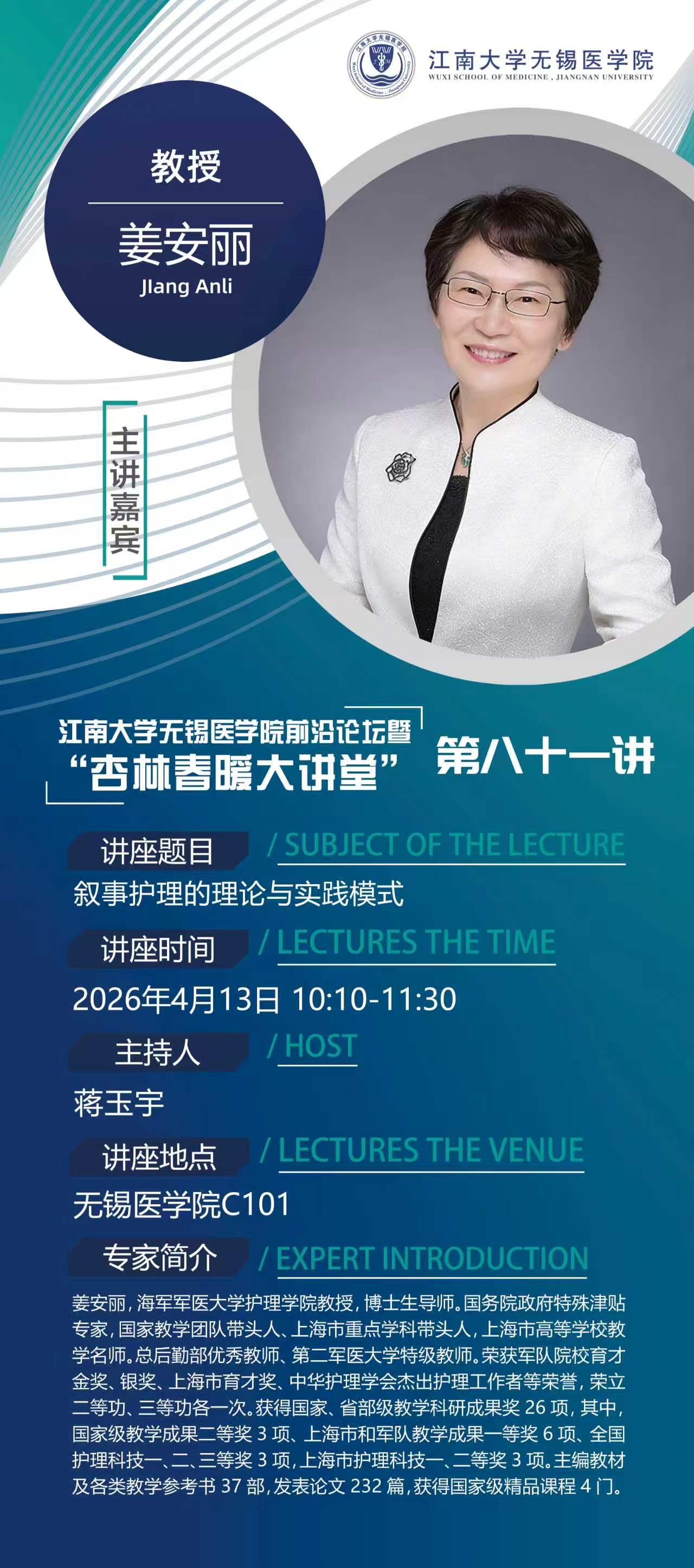 嘉宾简介:姜安丽,海军军医大学护理学院教授,博士生导师。国务院政府特殊津贴专家,国家教学团队带头人、上海市重点学科带头人,上海市高等学校教学名师。总后勤部优秀教师、第二军医大学特级教师。荣获军队院校育才金奖、银奖、上海市育才奖、中华护理学会杰出护理工作者等荣誉,荣立二等功、三等功各一次。获得国家、省部级教学科研成果奖26项,其中,国家级教学成果二等奖3项、上海市和军队教学成果一等奖6项、全国护理科技一、二、三等奖3项,上海市护理科技一、二等奖3项。主编教材及各类教学参考书37部,发表论文232篇,获得国家级精品课程4门。