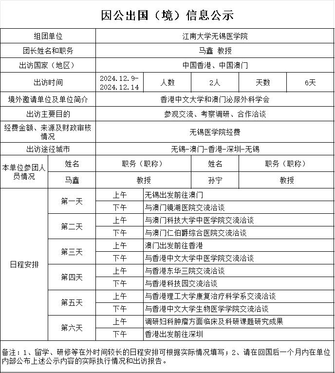 医学学科建设,经研究,我单位拟派马鑫率团一行2人于2024年12月9日赴香港、澳门参加学术交流、考察调研、洽谈合作。