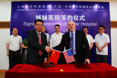 2017年7月2日,美国杜克大学肿瘤研究所(肿瘤中心)常务副所长Steven Patierno教授和魏庆义副所长应邀来到附院,进行参观访问和学术交流,在友好融洽的气氛中,双方签署了姐妹医院合作协议。