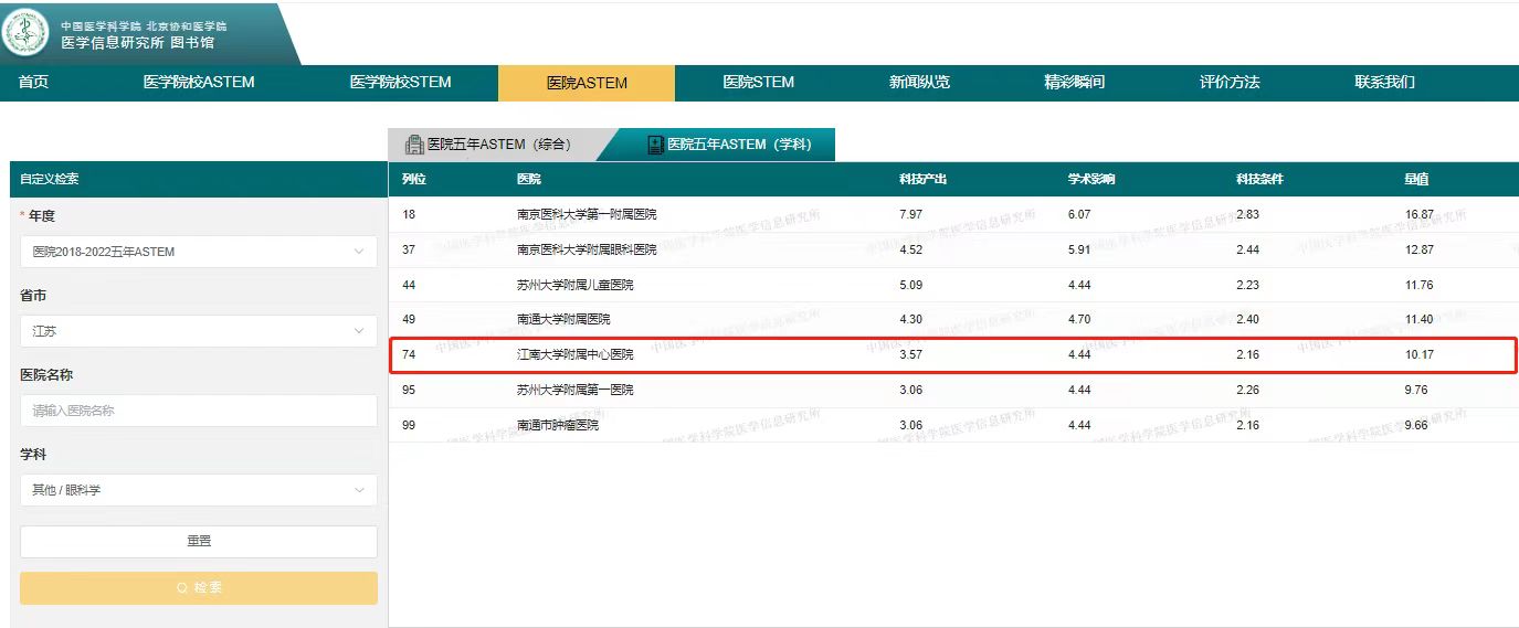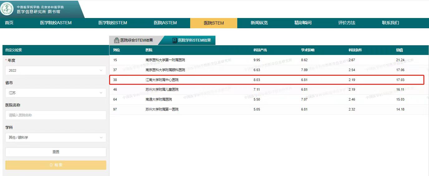 附属中心医院)泌尿外科学居2022年度中国医院学科科技量值第57位和五年总科技量值综合分值排名71位,该排名位居全省第四,全市第一。眼科学居2022年度中国医院学科科技量值居全省第三,全市第一;五年总科技量值综合分值排名居全省第五,全市第一。
